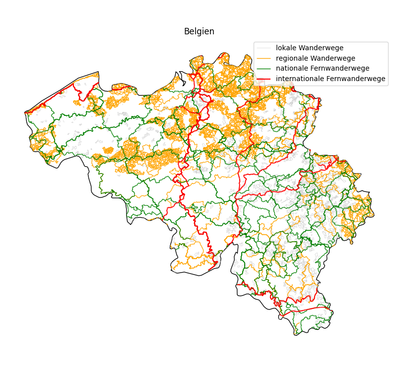 Das gesamte Netzwerk der signierten Wanderwege umfasst etwa 10.000 Kilometer. Diese Wege führen durch die vielfältigen Landschaften des Landes, von den sanften Hügeln der Ardennen bis zu den flachen Küstenebenen. Darüber hinaus gibt es zahlreiche lokale und regionale Wanderwege, die zusätzliche Möglichkeiten für Wanderer bieten.